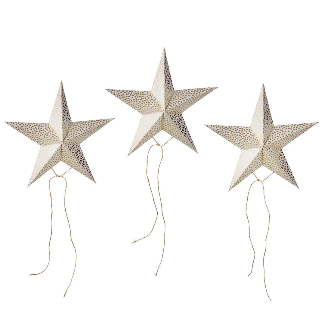 Die hübschen Dekosterne von BUNGALOW sind im schlichten nordischen Stil gehalten und ideal kombinierbar! Das Set besteht aus 3 Papiersternen in Creme mit goldenen Punkten.
